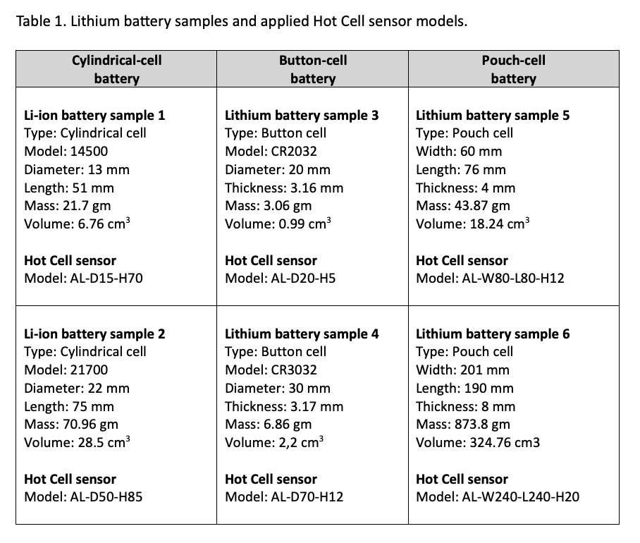 In this application note we demonstrate direct specific heat capacity (Cp) testing using the Hot Cell method1. This on six different Lithium battery samples of varying size and type: two of cylindrical-cell type; two of button-cell type; and two of pouch-cell type. Table 1 lists the details of the six battery samples, as well as the applied Hot Cell® sensor model for the respective battery samples. (We are not allowed to disclose the battery manufacturers that supplied us with these samples, hence they are anonymized.)