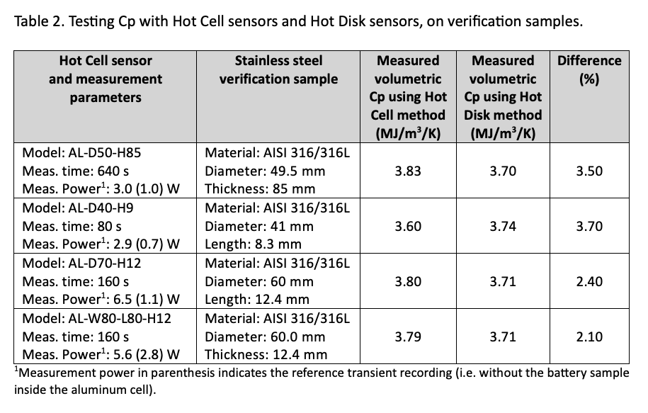 All testing reported here was performed using a Hot Disk TPS 2500 S instrument. Before testing the Lithium battery samples, we conducted tests on stainless steel verification samples with the Hot Cell® sensors. Table 2 lists the details of the verification samples, measurement conditions, and Cp results. For reference we also include Cp results from tests using the standard Hot Disk method2 and compared the differences. With Hot Disk sensors the thermal conductivity and thermal diffusivity of a sample are measured simultaneously, and the specific heat capacity of the sample is calculated from these two accrued properties. This indirect method of testing Cp is very accurate for homogeneous isotropic materials but not for anisotropic and/or heterogeneous materials, such as complete batteries, primarily because the testing is limited to a volume of the sample. The results in table 2 demonstrate that the Cp values obtained by the Hot Cell method differ less than 3.7% on average from those obtained by the standard Hot Disk method on verification samples.