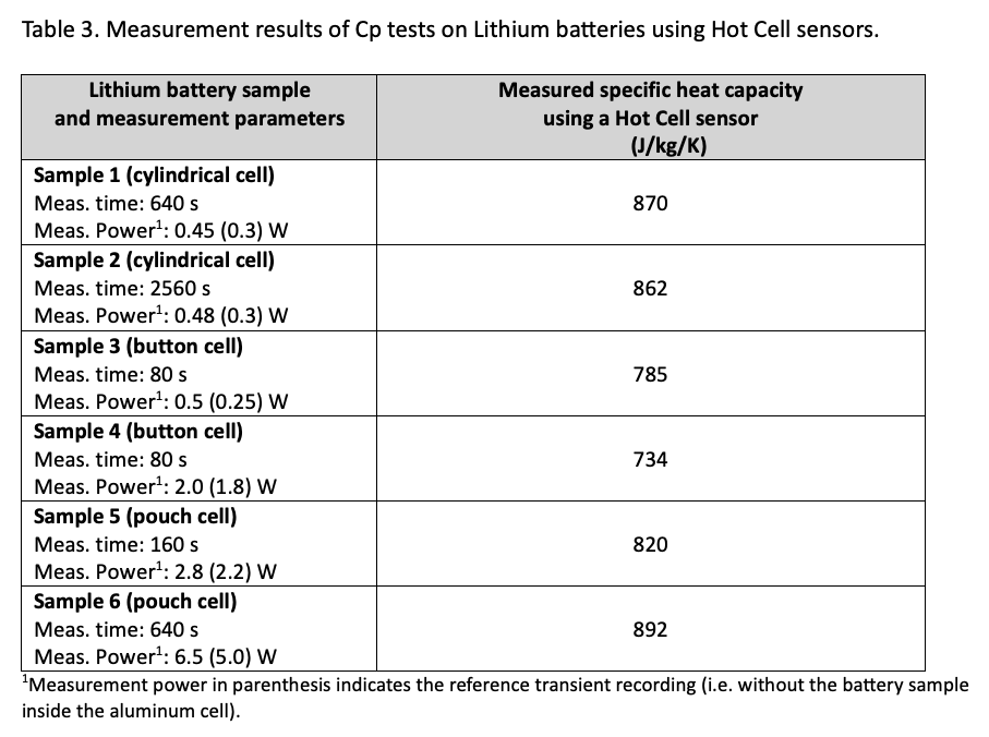 Next, the six (fully charged) Lithium battery samples were tested using the Hot Cell® sensors. Table 3 lists the measurement conditions and the Cp results in units of J/kg/K, as this unit is more common in the literature for Lithium batteries. Overall, we find that the obtained Cp-values with the Hot Cell® sensors are trustworthy, well-aligned with available data in the literature.